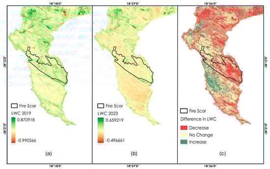 The Leaf Water Content Index (LWCI) is used as a representation of water content in vegetation. It is used to estimate changes in the water content in leaves []. Negative values of LWCI indicate dry leaves, while positive values indicate higher moisture content in the leaves. Figure 6 shows the LWCI in the Cape Peninsula for the period of 2019 and 2023 during the December periods. In the period 2019, positive values around the fire scar are observed, while negative values are observed in 2023; see Figure 6a,b, respectively. The values shown in Figure 6c clearly shows a decrease in LWCI for the year 2023. The vegetation became drier and more susceptible to the spread of wildfires.