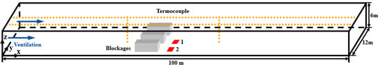 The full-scale tunnel, as depicted in Figure 1, with a rectangular cross-section, measured 100 m in length, 12 m in width, and 6 m in height. A steady-state heat release rate (HRR) of 10 MW was applied to the fire source, which is comparable to that of a small passenger bus or a 3-passenger car fire []. Four blockage cross-sections, with dimensions of 2 m × 2 m, 2 m × 3 m, 3 m × 3 m, and 3 m × 4 m (width × height) and a length of 5 m, were also introduced. As shown in Figure 1, three steel cubic blockages were positioned 1 m upstream of the fire source, in three lanes, to simulate vehicular blockages. Here, we regarded this as the most common longitudinal spacing between vehicles in a stopped state. The fire source was simulated using a heptane burner (2 m × 2 m), which was 2 m in length and 2 m in width and was located at the center of the tunnel. To account for the possibility of a fire occurring in any lane, two fire scenarios were modeled. The first scenario simulated a fire in the middle lane, while the second scenario simulated a fire in the side lane. The tunnel walls were modeled as concrete with electrical conductivity of 1.8 W/(m·K), specific heat of 1.04 kJ/(kg·K), and a density of 2280 kg/m3. One end of the tunnel was designated as a “supply” boundary condition, while the other end was set as an “open” boundary condition. The left end of the model was set as “Supply” with ventilation velocities of 0.4 m/s, 0.8 m/s, 1.2 m/s, 1.6 m/s, and 2 m/s, respectively. The test conditions are listed in Table 1.