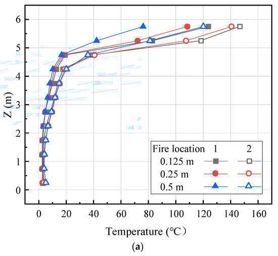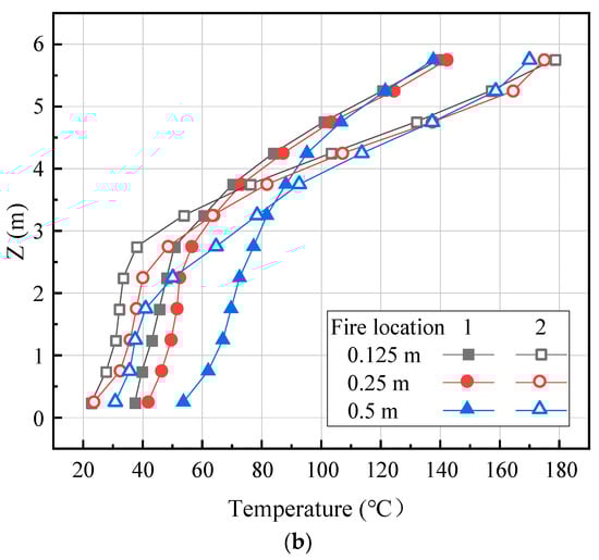 Figure 8 displays the longitudinal temperature distribution under three typical ventilation velocities. It can be observed that at a specific ventilation velocity and blockage ratio, the maximum temperatures at fire location 2 are higher than those at fire location 1. This can be attributed to two factors. Firstly, as per a previous summary [], the smoke spread process in large tunnels can be divided into five phases in terms of the smoke flow pattern. During the third phase, the smoke moves downwards along the vertical walls and creates an anti-buoyant wall jet that forces a portion of the smoke to flow back, resulting in a rise in the smoke temperature under the ceiling compared to the centerline of the tunnel. Secondly, the flame is tilted towards the side wall. The increased flame height can entrain more fresh air due to the confinement of the side wall, causing the ceiling to receive more heat.