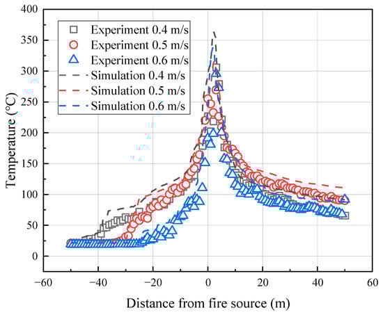 To further verify the accuracy and reasonability of the FDS model, we conducted a series of experiments in a 1:10 reduced-scale tunnel (10 m length, 0.7 m height, and 0.3 m width). A mechanical fan was installed at one end of the tunnel with 3 fixed air velocities of 0.4 m/s, 0.5 m/s, and 0.6 m/s. In our experiments, the alcohol pool fire source was placed in the middle of the tunnel without obstacles. The measured heat release rate was 32.13 kW, corresponding to 10.16 MW in the full-size model. We simulated the three sets of conditions in Figure 3, and it was clear that our numerical results were very close to the experimental data, confirming the validity of our study.