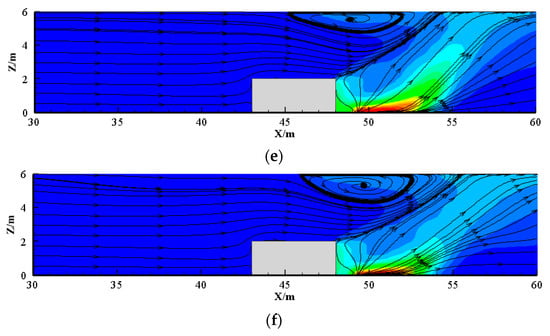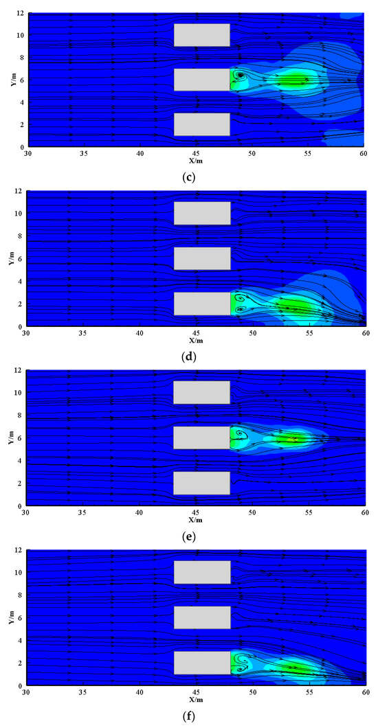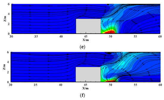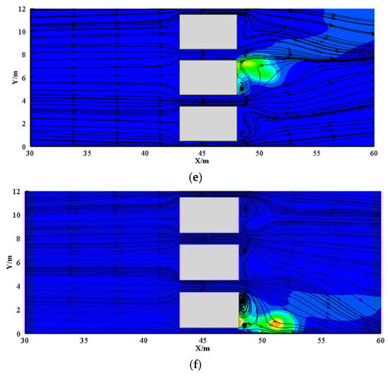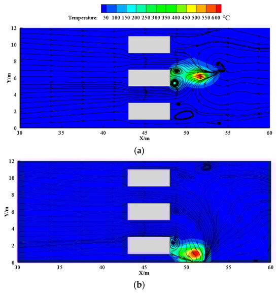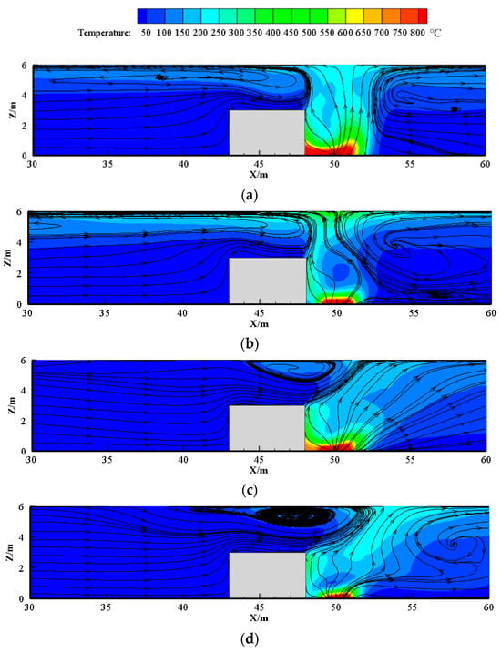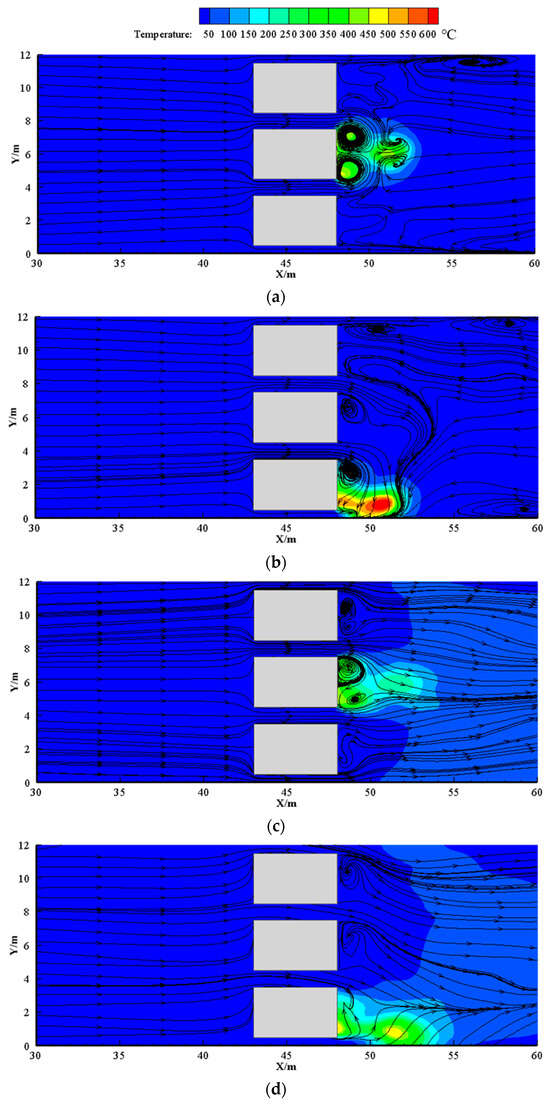 Figure 4, Figure 5, Figure 6 and Figure 7 display the temperature contours and flow fields in the vicinity of the blockages, as seen from the side and top views, under three different longitudinal ventilation velocities (u). As can be seen, as the longitudinal ventilation velocity rises as it passes the blockage, it encounters the upward heat flow, leading to the formation of large turbulence and a recirculation region between the fire source and the blockage, which has been discussed previously [,,].