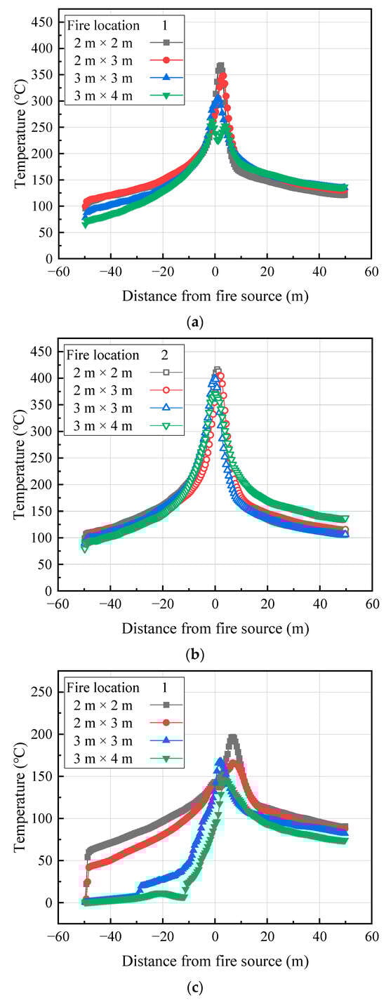 To determine the finest grid size, three grid sizes of 0.125 m, 0.25 m, and 0.5 m were evaluated when the heat release rate (HRR) was equal to 10 MW. The calculated grid size was found to be in the range of 0.15 to 0.59 m. As seen in Figure 2, the results indicated that there was no significant difference in temperature dispersion between 0.125 m and 0.25 m, suggesting that reducing the grid size did not result in improved accuracy. Instead, it led to a significant increase in processing time. Therefore, the finest grid size was determined to be 0.25 m.