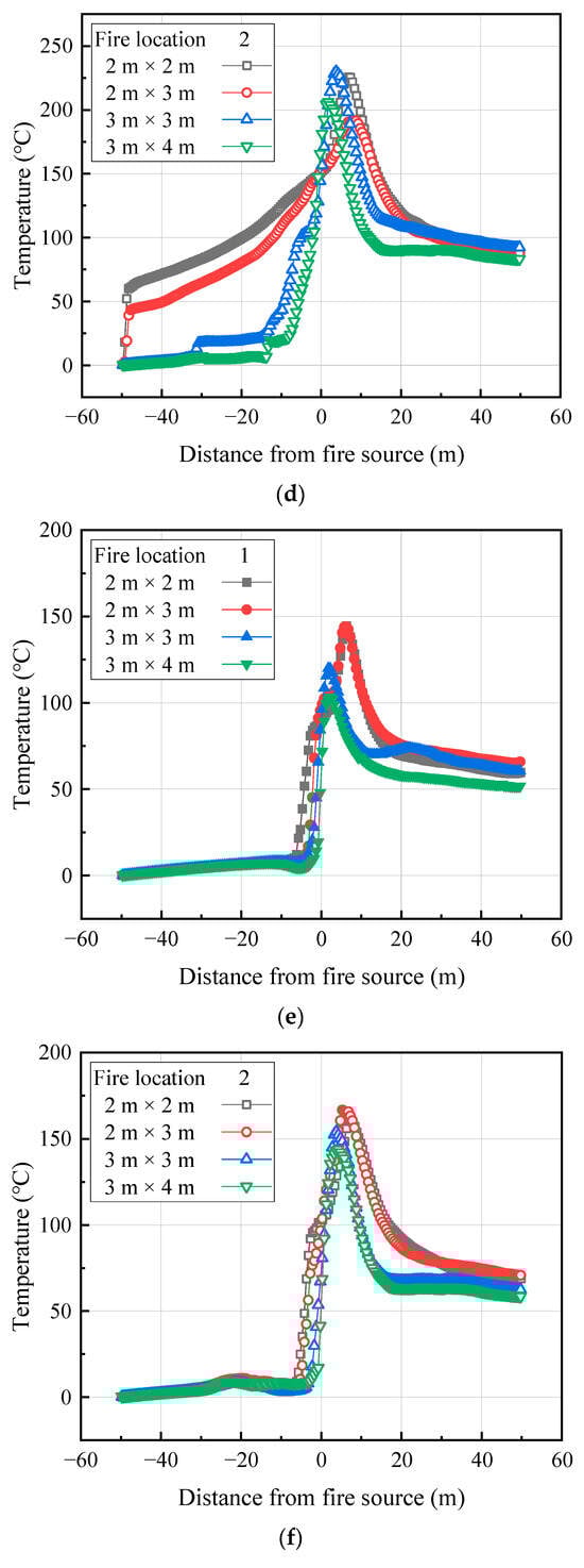 Longitudinal temperature distribution beneath tunnel ceiling under three ventilation velocities. (a) u = 0.4 m/s, fire location 1; (b) u = 0.4 m/s, fire location 2; (c) u = 1.2 m/s, fire location 1; (d) u = 1.2 m/s, fire location 2; (e) u = 2 m/s, fire location 1; (f) u = 2 m/s, fire location 2.