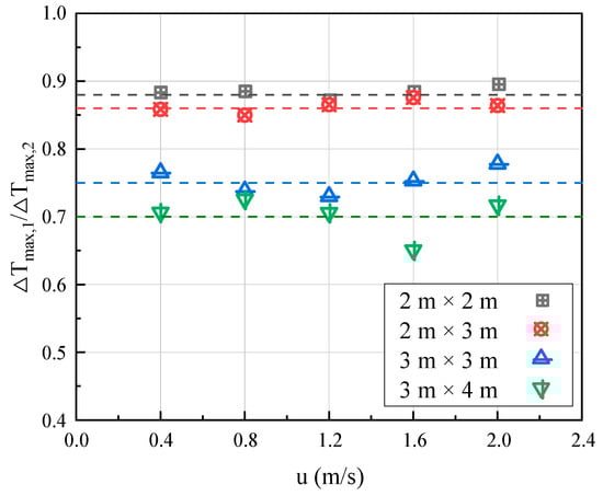 As can be seen from the results shown in Figure 10, the proportion of the maximum temperature rise at fire locations 1 and 2 decreases as the cross-sectional area of the obstruction increases. It can be seen that the blocking rate has a significant effect on the maximum temperatures induced by the two different fire locations; namely, as the blocking rate increases, the temperature at fire location 1 decreases more significantly. At the same time, the increase in the longitudinal ventilation rate, albeit causing some fluctuations in the maximum temperature rise, generally conforms to the horizontal fitting trend. It is noteworthy that a significant decrease in the proportion is observed when the height of the blockage changes from 2 m to 3 m. This highlights the fact that the height of the blockage, rather than its width, has a stronger impact on the temperature in a vehicle fire that occurs in the side lane.