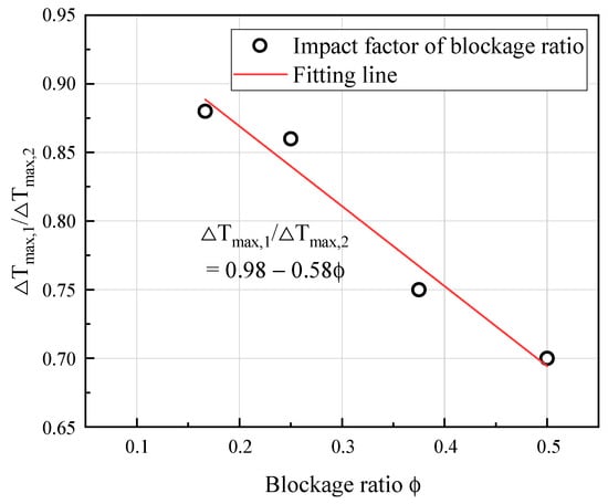 Based on the values of the horizontal fit in Figure 10, the relationship between the and the blockage ratio is correlated in Figure 11.