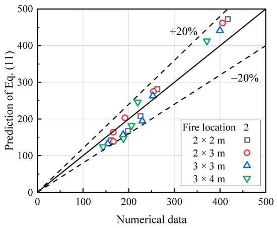 Figure 9 presents the comparison between the proposed formula (Equation (11)) and the numerical results. It can be seen that the calculated values show good agreement with the data.