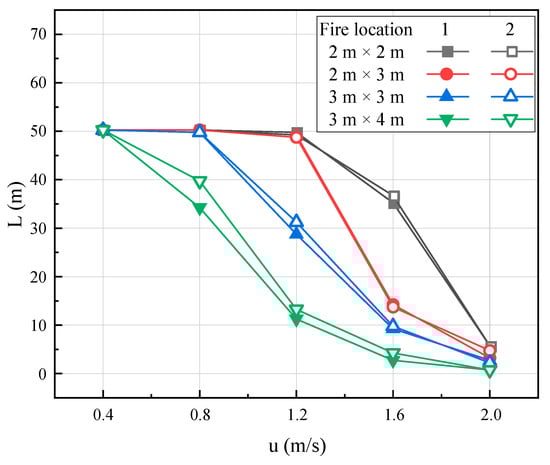 The length of the back-layering, denoted as , is a crucial factor in determining the success rate of evacuation for trapped individuals, and the presence of blockages has a direct impact on the smoke backflow [,,,,]. As demonstrated in Figure 8, which displays the longitudinal temperature distribution, the point at which the temperature begins to drop gradually is considered as the front of the back-layering smoke flow.