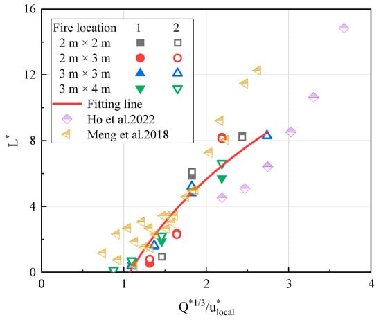 Dimensionless smoke back-layering length versus and comparison with Ho et al. [] and Meng et al. [].