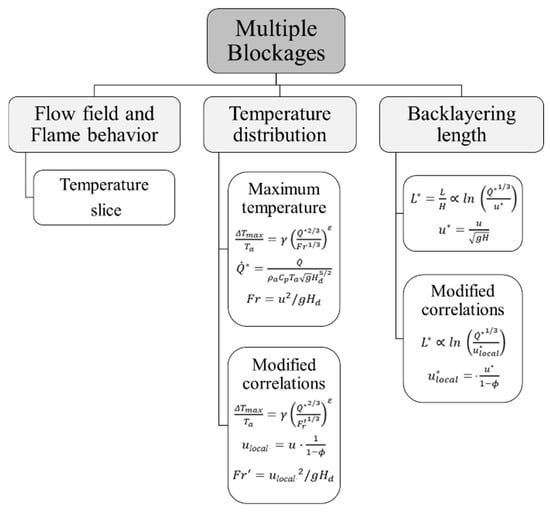 A comprehensive numerical simulation study was conducted to examine the impact of blockages of various sizes on three-lane tunnel fires. The flow fields of the near-fire regions were analyzed, and thorough assessments were performed on the maximum temperature and smoke back-layering length. The methods used in this study are shown in Figure 15. The following are the key results of the study.