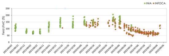 Cistus ladanifer before wildfire occurrence. In all cases, LFMC values in this shrub species were below the threshold of 80% generally considered by the regional fire management service as indicating a high fire risk level in the early warning system, i.e., as a value associated with a significant increase in vegetation flammability [