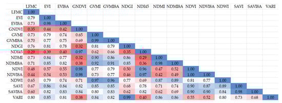 19]. Conversely, the SIs including visible and NIR (generally indicating vegetation greenness and growth) were better correlated in this case, being indirectly linked with LFMC through the change in leaf pigment content [