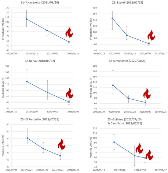 Our results regarding LFMC estimation with the best model, applied to historical wildfires occurring from 2018 to 2022 in the study area, indicated that the empirical model proposed based on spectral information from Sentinel-2 efficiently detected a decreasing trend in moisture content of