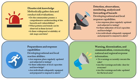 This was acknowledged as a significant movement away from reaction and recovery and toward prevention and preparation in the Hyogo Framework for Action 2005–2015, a worldwide blueprint for disaster risk reduction. The Hyogo Framework lists improving early warning systems and identifying, evaluating, and monitoring catastrophe risks as one of its five action objectives []. Crucially, the Hyogo Framework emphasized the need for people-centered EWSs, which would take into consideration differentiable risks, provide instructions on how to respond to warning information, and assist decision-makers in taking appropriate action [].