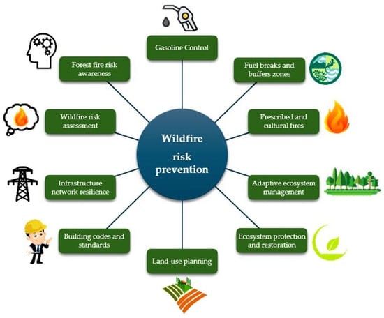 Upgrading climate change adaptation strategies is essential to lowering the probability, behavior, and effects of wildfires ex ante in the context of rising severe wildfire risk []. Any action that lessens the risk of wildfires occurring as well as the exposure and susceptibility of buildings and communities to them ex ante is considered wildfire prevention []. Preventive strategies include buffer zones, controlled and cultural fires, fuel breaks, and other structural or “physical” methods of managing fuel loads and continuity. They also include adaptive management, ecosystem restoration, and protection []. Organizational measures are essential for lowering the ex ante danger of wildfires in addition to physical ones []. These include rules on construction norms and standards, land-use planning, and infrastructure management that is fire-resistant []. Moreover, post-fire rehabilitation, which is crucial to enhancing long-term resilience to wildfires, may combine wildfire preventive strategies [,]. To reduce the effects of extreme wildfires on society and government alike, wildfire prevention also requires adjusting wildfire risk assessment to account for projected climate change impacts on wildfire activity and increasing awareness-raising efforts (Figure 2).