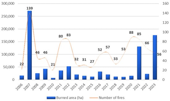 Like many other Mediterranean nations, Greece has long encountered meteorological conditions that might facilitate the beginning, development, and maintenance of flames [,,]. The Fire Weather Index (FWI) is one measure of the pertinent meteorological conditions. It takes into account several factors that influence fire behavior []. Furthermore, Greece is among the few areas in the EU with some of the highest FWI ratings. The country’s yearly scorched area, which totaled 50,735 hectares between 2006 and 2023, is a reflection of the significant fire danger [] (Figure 3).
