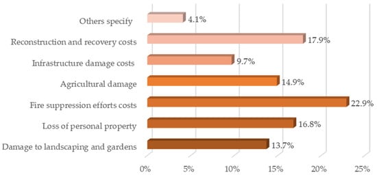 The survey employed Likert scale-rated questions to assess the influence of each factor on property damage costs. The information presented in Figure 4 was obtained from the answers to a question included in the online survey: “Which categories of property damage costs have you incurred in wildfires?” The answers available to the respondents comprised firefighting costs, reconstruction and recovery expenses, personal property losses, destruction of landscaping and gardens, crop losses, infrastructure losses, and other expenses like higher insurance premiums and health costs. The question posed enabled respondents to tick all categories that they considered relevant to their experiences. The percentages depicted in Figure 4 reflect the portion of the respondents who mentioned different types of costs as part of their experiences with wildfire property damages and are based on the survey responses, which means that the values presented do not distort the experiences of the respondents.
