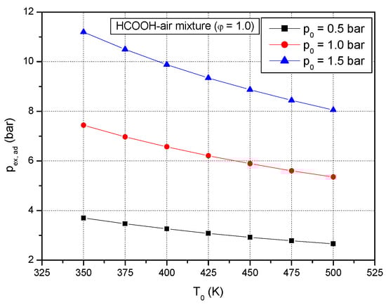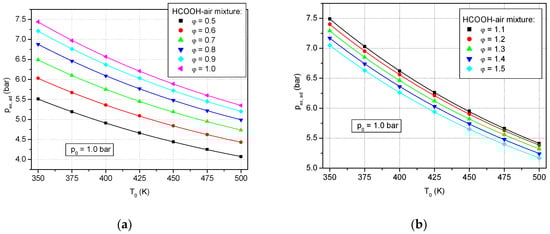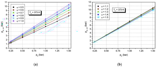 In Figure 4, the influence of initial pressure on peak adiabatic explosion pressure for a stoichiometric formic acid–air mixture is shown. Figure 5 shows the variation of the calculated adiabatic explosion pressure of various concentrations of formic acid–air mixtures versus initial pressure at initial temperature T0 = 373 K: Figure 5a for lean and stoichiometric mixtures, and Figure 5b for rich mixtures. At constant initial temperature, the calculated adiabatic peak pressure is correlated with the initial pressure by the linear equation:
