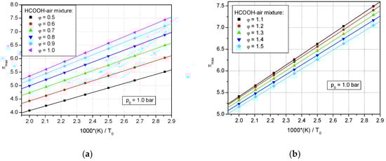 Variation of dimensionless adiabatic peak explosion pressures at p0 = 1.0 bar, in correlation with the reciprocal temperature of lean and stoichiometric formic acid–air mixtures: (a) lean and stoichiometric mixtures; (b) rich mixtures.
