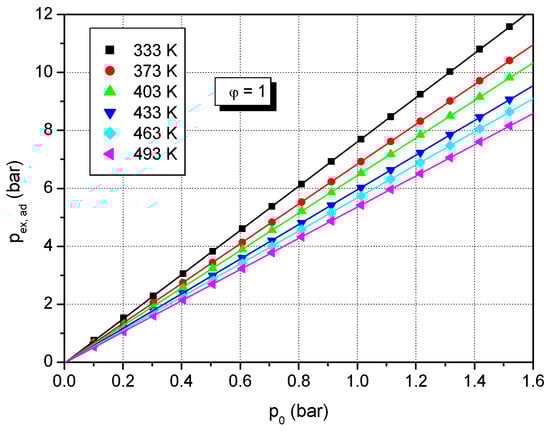 p0 = 1 bar, T0 = 433 K: pex,ad (bar) = 1.388 + 8.133·φ − 3.474·φ2; rn = 0.993 (11 points)