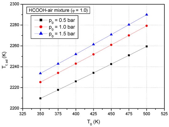 Predicted adiabatic flame temperatures of premixed stoichiometric formic acid–air flames versus initial temperatures at various initial pressures (p0: 0.5 bar, 1.0 bar, 1.5 bar).