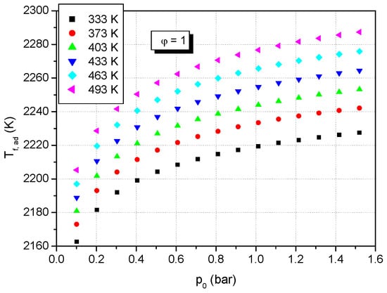 Figure 6 and Figure 7 show the plots of formic acid–air mixture adiabatic peak pressures at different initial temperatures and pressures. Thereby, the variation of calculated equilibrium pressure with equivalence ratio at ambient initial pressure and different initial temperatures (T0: 373 K and 433 K) is presented in Figure 6. Two sets of data obtained of calculated equilibrium pressure at ambient initial pressure and two different initial temperatures, 373 K and 433 K, are plotted in Figure 6 versus equivalence ratio. They were fitted against formic acid concentration (equivalence ratio) by second-degree polynomials: