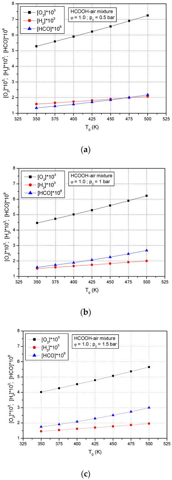 The premixed flame structure is described by several important parameters, such as the flame temperature and concentrations of chemical species within the flame front. The examination of the species (radicals or products) distribution within the flame front is necessary to find the main radicals and dominant reactions that are the basis for control of the reaction pathways of hydrocarbon oxidation. The GASEQ software by Morley [] was used to determine the adiabatic flame temperatures and concentrations of chemical species (intermediate radicals, main products) within the flame front, for formic acid–air mixtures at various initial conditions (temperature, pressure, and equivalence ratio).
