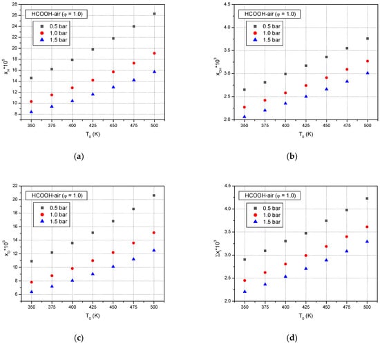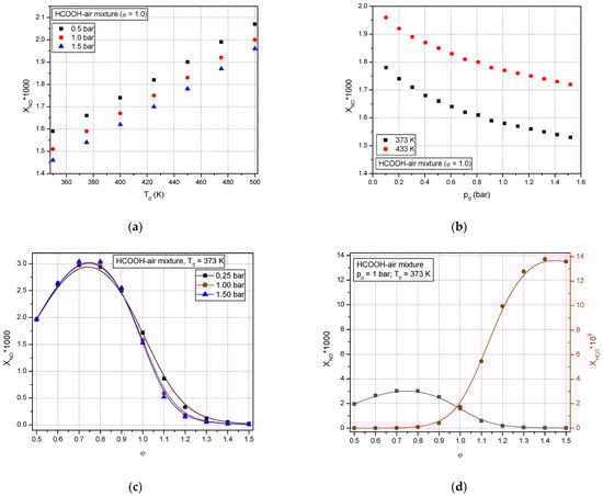 As observed by other flammable substances, the highest value of the calculated equilibrium pressure of formic acid–air mixtures is found at the equivalence ratio of 1.1 for all investigated initial conditions (as shown in Figure 6 and Figure 7), as reported for other fuel–air mixtures.