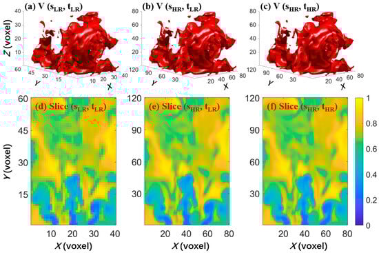 SR is a successful method that is frequently applied in a variety of disciplines, including microscopy, satellite surveillance, computer vision, and others. SR has been proven to work in both 2D and 3D space, in the space and time domain, and in reacting and non-reacting flows in a more limited range of turbulent flow and combustions. In the early days of 2D SR, the SR problem was treated as an inverse problem of upscaling the low resolution (LR) images to generate a high-resolution (HR) image with additional features, which are fundamentally unknown. The kernel-based SR reconstruction of 2D images has been investigated for decades. Convolutional neural network layers have been used more recently in learning-based SR techniques to learn the features of the images and rebuild the HR with perceptual information. A detailed analysis of the application of machine learning to turbulent flows must be performed, nevertheless considering the intricate spatial structures of extremely turbulent flows. For instance, Xu et al. applied deep learning to combustion diagnosis by using a GAN to predict the HR structure of a 3D flame field []. Cheng et al. used a GAN to predict 2D smoke signals. By inputting the luminosity projection of jet flames, they were able to reconstruct the 3D distribution of smoke particles, providing new insights into the formation and distribution of smoke []. Zhang et al. report a computational method based on deep learning (DL) to generate planar distributions of soot particles in turbulent flames from line-of-sight luminosity images []. Anthony Carreon et al. applied GAN to generate realistic flame images based on a time-resolved dataset of hydroxide concentration snapshots obtained from planar-laser-induced fluorescence measurements of a model combustor []. Fukami et al. reported machine-learning-based spatiotemporal super-resolution reconstruction of 2D isotropic turbulence and 3D channel flow []. Dong et al. achieved temporal interpolation using computational imaging by artificially generating sequential OH PLIF images at 200 kHz based on 100 kHz and accelerating the high-speed planar imaging of turbulent flames with a convolutional long short-term memory network [,]. Similar applications of the machine learning models in a variety of flow reconstructions are inspired by these earlier works based on data reconstruction using these models [,,], which moderately overcome environments in which only partial or low-resolution spatiotemporal data are available due to the limitations of measurement equipment or computational resources. Nevertheless, to the authors’ knowledge, the spatiotemporal SR imaging in the 3D combustion field has not been reported.