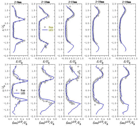 Mean and RMS velocity comparison of LES simulation in this work and experimental data [] of the swirl flame at different stations at the indicated distance from the bluff-body.