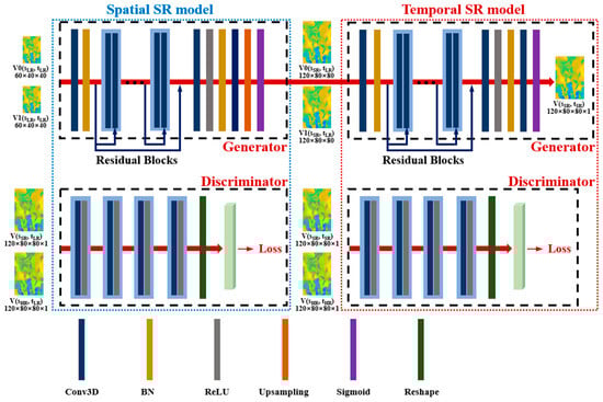 For the spatial SR model, we prepared a set of inputs, V(, ) and V(, ), as the training data to obtain the intermediate result, V(, ), which acts as input for the successive temporal SR model. The generator of the spatial SR model first reads the LR data V(, ) and upsamples it into spatial SR counterparts V(, ), while the discriminator of the spatial SR model judges the model-predicted spatial SR data, V(, ), from its counterpart, V(, ). As can be seen from Figure 3, each colored rectangle represents a specific operation. The size of the 3D convolutional kernel was fixed at 3 × 3 × 3, and the number of output channels and strides were set to 64 and 1, respectively, which represents a compromise between computing cost and model performance. For each convolution operation, a zero-padding operation was used to maintain the size of the input data. Moreover, we used a rectified linear unit (ReLU) as the activation function. The use of ReLU is known to be an effective tool for stabilizing the weight update in the machine learning process []. In particular, we extended the generator model by introducing skipped connections, as shown by the blue arrows in Figure 3. The use of skip connections can enhance the model’s learning capability by relieving convergence issues, which is known to be a problem with deep neural networks. The combination of skip connections and residual blocks helps avoid gradient dispersion and deepen the network without too much extra coding []. The detailed structure of the discriminator is also depicted in the lower part of Figure 3. The number of its output channels progressively increased from 4 to 64, allowing the discriminator to distinguish subtle differences between the model-predicted SR result and its ground-truth. Eventually, each discriminator outputs a long vector of 44,752,850 elements with a feature distribution of either model-predicted or ground-truth data.