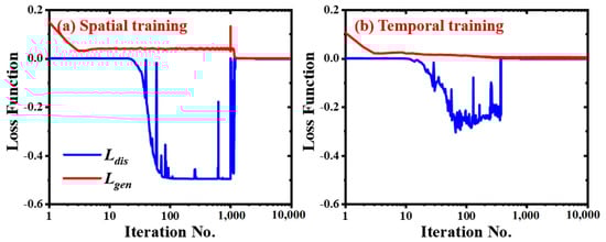 Evolution of the loss functions for the training process: (a) loss function variation of spatial SR training and (b) loss function variation of temporal SR training.