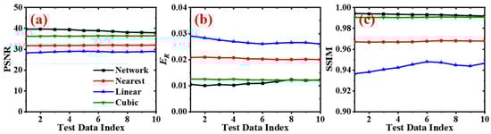 The quantitative comparison between our spatial SR model and three traditional interpolation methods, namely, nearest, linear, and cubic: (a) variation of PSNR; (b) variation of ER; (c) variation of SSIM.