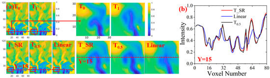 As shown in Figure 6, based on the results of spatial reconstruction, new frames were reconstructed between each pair of adjacent frames in the sequence, achieving a twofold increase in the temporal resolution of the swirling flame. Figure 6a displays the slicing images of the swirling flame at two time frames (T0, T1), as well as the SR images of time based on the SR model and linear interpolation. It can be observed from the red square in the figure that the result of linear interpolation lost the small swirling flame structures. In contrast, the result from the SR model was more in line with the dynamic changes of the flame. Figure 6b shows a one-dimensional comparison of the results along the red dashed line, and it can similarly be observed that the result of the SR model had temporal extension, while the linear interpolation result was merely an average one, without temporal correlation.