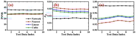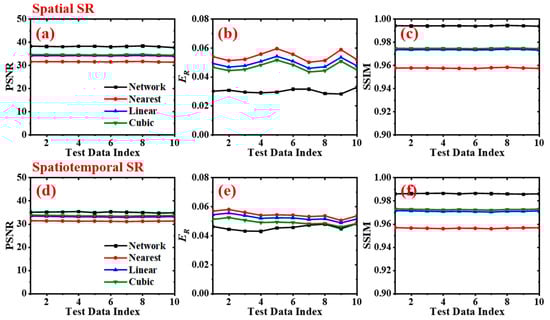 The outcomes of the interpolation methods were compared with the intermediate outputs produced by the spatial SR process as a first-stage evaluation, as shown in Figure 5a–c. A number of conclusions can be drawn from the figure. Due to the three interpolation algorithms’ various operating principles, the cubic interpolation came in first place. Second, among the four techniques, the proposed spatial SR model performed the best in terms of reconstruction. Lastly, the test dataset shows consistent reconstruction quality for the SR model and the three interpolation approaches, indicating a reliable and convincing model performance. Specifically, the cubic technique yielded 36.29 dB and 0.991, respectively, which is the optimal interpolation, compared to the mean values of 37.94 dB and 0.992 for the PSNR and SSIM of the spatial SR model. In terms of the mean ER, the spatial SR’s value of 1.2 percent was just marginally higher than the cubic method’s 1.21 percent. This indicates that the spatial SR process is effective enough to produce superb spatial reconstruction with an upscaling factor of 2, which can deliver a high-quality input for the subsequent operations of temporal SR.