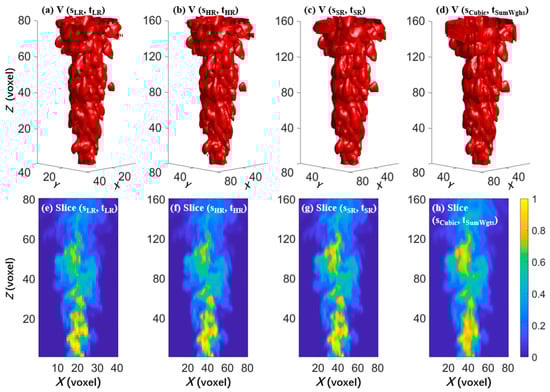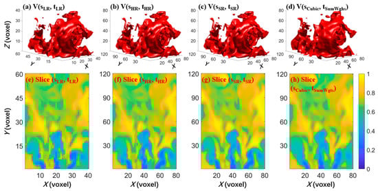 Visual comparison of the spatiotemporal SR reconstruction of jet flame: (a–d) 3D structure; (e–h) 2D central slice.