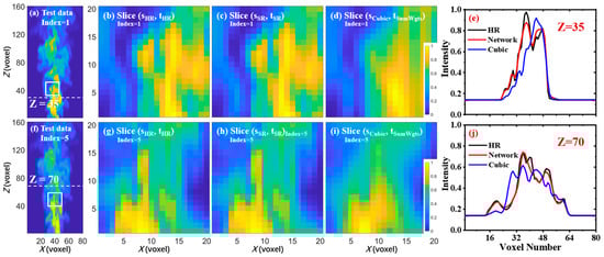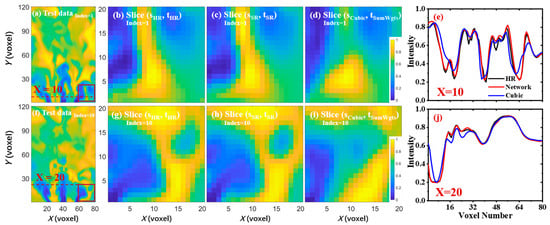 Even so, it is still a little laborious to directly observe the superior Slice(, ) over Slice(, ). Hence, we amplified several local regions and performed intensity variation comparison to better illustrate the visual difference. Figure 9b–d are locally zoomed views of 2D slices, as marked with a red rectangle in the test data sample of Figure 9a. It can be seen obviously by an eye-ball check that there is almost no visual difference between the SR results and the original HR data, while the cubic interpolation results cannot accurately restore the characteristic distribution. To aid the visual examination of the SR effect in space and time, Figure 9e further illustrates the variation of the flame intensity along a horizontal line, as depicted by dashed red line in Figure 9a with X = 10. We can see that the intensity variation of the spatiotemporal SR model was in better agreement with the ground truth, while the cubic interpolation had a significant deviation. Moreover, Figure 9f–j supplement the local enlarged view and intensity variation of another flame at a different time instant. As before, the Slice(, ) still maintained an obvious advantage over Slice(, ) by recovering more detailed topographic features. The intensity signal of inbetweening displays more anastomotic agreement with HR data in Figure 9j. These above demonstrations illustrate how our model can effectively reconstruct the inbetweening volume with high resolution and accurate signal variation by using a deep learning network.