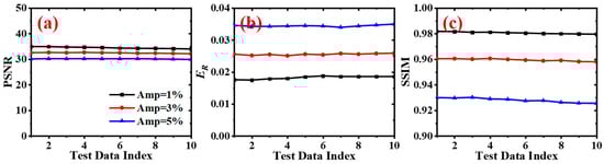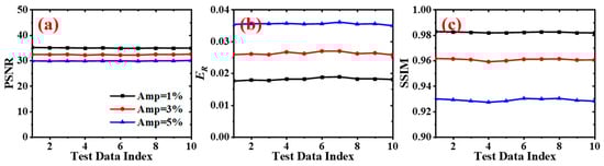 where amp represents the amplitude of random noise. The amplitudes were 1%, 3%, and 5% in turn. Figure 10 displays the noise immunity performance of the pre-trained network with amp = 1%, 3%, and 5%, as evaluated by the three metrics of the PSNR, ER, and SSIM. Such added noise caused the degradation of the SR quality. As can be seen from Figure 10, the metrics of PSNR, ER, and SSIM almost held unchanged with amp = 1%. When amp increased to 3% and 5%, the mean value of PSNR decreased by 3 dB and 5.4 dB, the mean value of ER rose by 0.9% and 1.8%, and the mean values of SSIM decreased by 0.024 and 0.056, respectively. Nevertheless, the variation in Figure 10 displays a satisfactory generalization performance for unforeseen noise. It is noted that the weight parameters of our model did not update specifically when using the extra added noise. Therefore, the consistently better performance proved that the proposed network was somehow immune to the random noise, and an even better reconstruction quality can be expected if the noisy input is used in training.