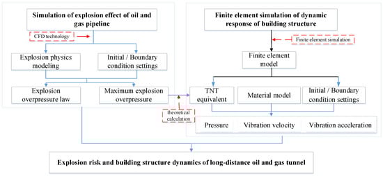 In this paper, a segment of the oil and gas long-distance pipeline stretching from Dalian to Shenyang in China serves as the focal point of the research. By leveraging computational fluid dynamics technology and finite element analysis methods, the study constructed simulation models for the effects of natural gas explosions in full-scale, ultra-long tunnel spaces and the dynamic response of building structures under explosion impacts. The investigation included numerical analyses of the disaster effects of oil and gas explosion overpressure for tunnel lengths of 4000 m, 8000 m, and 16,000 m, along with the establishment of an equivalent conversion between maximum explosion peak overpressure and TNT mass through theoretical formulas. Consequently, the study delved into the explosion shock response process and vibration risk patterns of ground building structures under varying soil depth conditions. The research findings are valuable in proposing and strengthening risk prevention and control measures for underground, long-distance natural gas pipeline leakage and explosions, thereby providing valuable insights for the safety analysis of vital protective structures. These research ideas are illustrated in Figure 1.