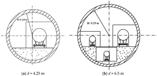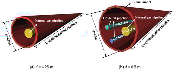 The focus of this study is on an ultra-long natural gas/crude oil pipeline buried underground between Dalian and Shenyang in China. This pipeline is of particular interest due to its potential impact regarding the explosion consequences of oil and gas pipelines, given its location beneath urban buildings. The construction method for this pipeline primarily involved the use of a shield tunneling scheme. The shield employs deep burial techniques to traverse residential areas, with the tunnel being buried at depths ranging from 20 to 40 m below the surface. The shield tunnel spans a total length of 16,000 m. When considering the laying of one pipeline or of three pipelines within the shield tunnel, the inner diameters (d) of the tunnel are 4.25 m and 6.5 m, respectively. The cross-sections and structures of the two tunnels are depicted in Figure 2. In the smaller tunnel, a 1.219 m natural gas pipeline is installed, while the larger tunnel accommodates a 1.219 m natural gas pipeline along with two crude oil pipelines. The inner diameters of the two crude oil pipelines are 0.711 m and 0.61 m, respectively.