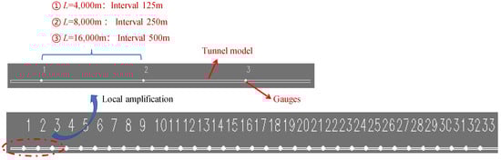 To account for the presence of multiple valve chambers within the tunnel, the 16,000 m tunnel was segmented into sections of varying lengths. As a result, three tunnel models were constructed with lengths of 4000 m, 8000 m, and 16,000 m, each featuring inner diameters of 4.25 m and 6.5 m. This approach led to the creation of six tunnel explosion simulation scenarios, aimed at investigating the impact of different tunnel diameters and lengths on oil and gas explosion effects. In order to capture the time-history evolution and peak values of the explosion load within the tunnel, a total of 33 gauges were strategically placed along the geometric center line of the model. These gauges were evenly distributed at intervals of 125 m, 250 m, and 500 m in the 4000 m, 8000 m, and 16,000 m models, respectively, as illustrated in Figure 4.