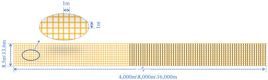 In order to reduce the influence of the boundary of the computational domain on the numerical solution of the explosion, several meters are extended along the three directions of the models X\Y\Z, respectively. Finally, six kinds of computational domain sizes (length × width × height) under the combination of two tunnel inner diameter areas (4.25 m, 6.5 m) and three tunnel lengths (4000 m, 8000 m, 16,000 m) were derived, which were the following: (1) 4000 m × 8.5 m × 8.5 m; (2) 8000 m × 8.5 m × 8.5 m; (3) 16,000 m × 8.5 m × 8.5 m; (4) 4000 m × 13.6 m × 13.6 m; (5) 8000 m × 13.6 m × 13.6 m; (6) 16,000 m × 13.6 m × 13.6 m. The final total number of grids were 392,098, 784,196, 1,568,392, 648,162, 1,296,324 and 2,592,648.