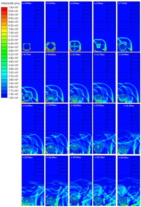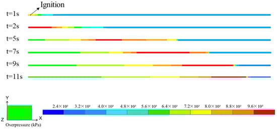 Figure 6 illustrates the evolution process of natural gas explosion overpressure within the tunnel space. As the initial shock wave of the explosion traveled towards one end of the tunnel containing unburned gas, the violent combustion reaction zone (depicted in red) gradually expanded before diminishing. The propagation of the explosion shock wave exhibited stages of rapid growth followed by a slower decline, a pattern that aligns with the findings of the LPG/DME deflagration experiment conducted by Zhang et al. []. This observation indicates that the shock wave undergoes intense development in the front and middle sections of the tunnel. Due to the influence of reflected waves, the acceleration of the explosion flame at the tunnel’s end decelerated or even hindered the explosion’s progression, leading to a reduction in the speed of explosion propagation and a decrease in the extent of the violent reaction zone.
