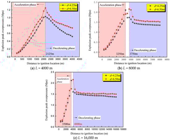 Figure 8 displays the maximum explosion pressure-time curves for tunnel diameters of 4.25 m and 6.5 m across various tunnel lengths. The graph highlights a distinct pressure peak (Pmax) on the explosion overpressure curve, which occurred when the explosion flame area reached its maximum extent. As the tunnel length increased, the internal maximum explosion peak overpressure gradually rose, and the peak arrival time progressively delayed. Notably, when the tunnel lengths reached 8000 m and 16,000 m, the disparity between the maximum overpressure peak and its arrival time diminished significantly. This observation suggested that the explosion effect does not exhibit a substantial difference with the increase in natural gas volume. The analysis performed indicated that in the case of extensive tunnel lengths, the cumulative contribution of a specific point explosion to the energy at distant locations decreased with distance. Therefore, for tunnel space explosions characterized by high aspect ratios, where the space extends infinitely in a single direction, the maximum explosion overpressure at a particular position may not demonstrate significant variations.