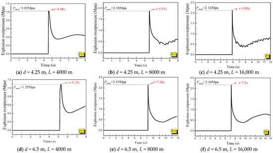 The time history curves of the maximum explosion overpressure under different tunnel diameters and lengths.
