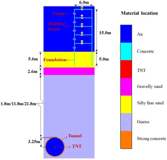 In this study focusing on the physical characteristics of long-distance natural gas pipeline tunnels and adjacent ground building structures, a two-dimensional simulation model of explosion response was established using AUTODYN software. The model comprised various components, including the explosion source, tunnel, fine sand, gravel sand, gneiss, building, and air, as illustrated in Figure 9. The tunnel was situated deep within the underground soil, featuring an inner diameter of 3.25 m and a wall thickness of 0.2 m. The explosion source was represented by TNT positioned at the center of the tunnel. Considering the geological layers, three distinct types of soil layers were identified within the tunnel from top to bottom, namely fine sand, gravel sand, and gneiss. The fine sand layer was buried at a depth of 5.60 m, while the gravel sand layer was located at a depth of 2.6 m. To investigate the impact of varying tunnel soil depths on the explosion response of ground buildings, the gneiss layers were positioned at depths of 1.8 m, 11.8 m, and 21.8 m, respectively. Consequently, the total depths of the three soil layers amount to 10 m, 20 m, and 30 m, respectively.