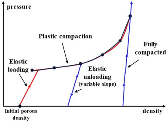 In 2001, Lin and Laine et al. [] introduced a SAND constitutive model to characterize the mechanical behavior of sand under dynamic loading conditions. The model is grounded in Granular material model theory and integrates a series of mechanical test outcomes from sand samples to establish the specific form of the model and its associated parameters. The SAND constitutive model has been incorporated into the material database of the AUTODYN numerical calculation software. This model comprises two primary components: the linear compaction state equation and the particle strength model. The linear compaction state equation delineates the plastic compaction progression of the material through a piecewise linear function correlating pressure and density, as illustrated in Figure 10. Additionally, a piecewise linear function linking sound velocity and density is employed to depict the elastic loading and unloading process of the material.