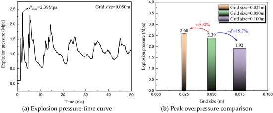 The grid independence test holds the utmost importance in constructing numerical models, as the quality of meshing directly impacts the accuracy of numerical simulation results. A common practice for grid verification involves comparing numerical calculation results using three different grid sizes: small, medium, and large. To enhance calculation efficiency while ensuring that the relative error of the explosion peak pressure does not exceed 10%, a larger grid size is selected for numerical calculation []. In this study, grid sizes of 0.025 m (small), 0.050 m (medium), and 0.100 m (large) were used to partition the finite element calculation domain. The comparison of explosion peak pressure near the inner wall of the tunnel is illustrated in Figure 11. The figure shows that due to multiple reflections of the explosion wave within the tunnel structure, multiple pressure peaks were observed, with the first peak being the most significant. Subsequent peaks gradually decreased with decreasing explosion energy. As shown in Figure 11b, the relative error (δ) of the simulated peak overpressure under the grid sizes of 0.025 m and 0.050 m was 8%, which fell within the acceptable error range. The pressure error obtained with the 0.100 m grid size exceeded 10%, indicating poor simulation accuracy compared to the other two grid sizes. To enhance simulation efficiency and achieve more accurate results, this study opted for the 0.050 m grid size for numerical calculations.
