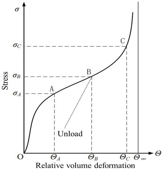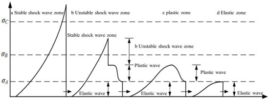 In finite element simulations, the propagation and attenuation of explosion pressure in soil are governed by the functional relationship between stress and relative volume deformation when the soil medium undergoes compression. This relationship is depicted in Figure 13. When the peak explosion pressure P was greater than the critical stress σC, it propagated through the soil in the form of a shock wave. For pressures between the stress thresholds σA and σC, the propagation took the form of an elastic-plastic wave, while pressures below σA resulted in elastic wave propagation.