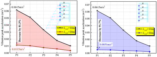The analysis presented in Figure 16 focuses on comparing the maximum vibration peak acceleration at various measuring points across different soil depths to investigate the vibration response characteristics of different positions on the building structure’s surface. Notably, gauge 1 (P1) consistently exhibited the highest vibration peak acceleration, attributed to its proximity to the explosion source. As the soil depth increases, the propagation path of the explosion shock wave lengthened, leading to increased energy dissipation as the shock wave traveled through the soil. The presence of distinct soil layers with varying densities, such as fine sand, gravel sand, and gneiss, further influences the dissipation of shock wave energy. The shock wave underwent multiple reflections and dissipations as it transitioned between different soil media, resulting in significant energy loss. Comparing the vibration acceleration at gauge 1 under soil depths of 20 m and 30 m to that under a 10-m soil depth, a substantial decrease was observed. Specifically, the vibration acceleration decreased by 81.3% and 91.7% under soil depths of 20 m and 30 m, respectively.