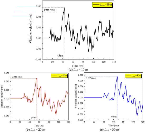 The vibration velocity time curve of gauge 1 under different soil depths.